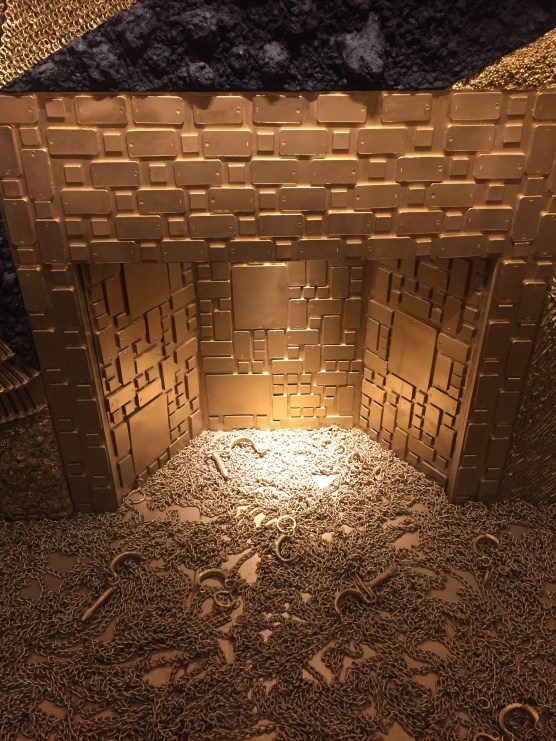 At the art museum: This was the inside of a Lincoln cabin-esque house built by gold, bullets, iphones, pills, etc on a foundation of shackles for slaves.
